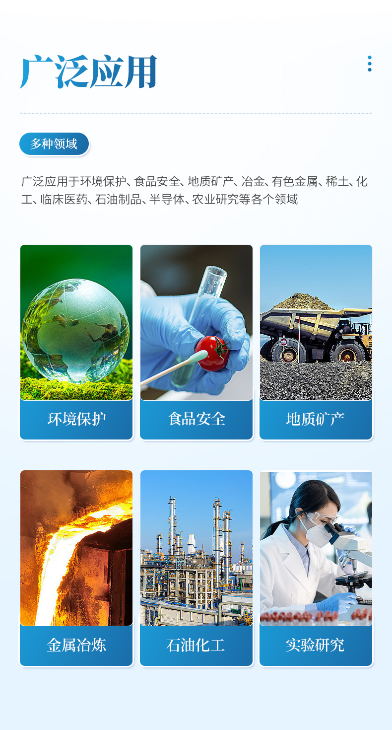 目前儀器廣泛應用于環境保護、食品安全、地質礦產、冶金、有色金屬、稀 土、化工、臨床醫藥、石油制品、半導體、農業研究等各個領域。