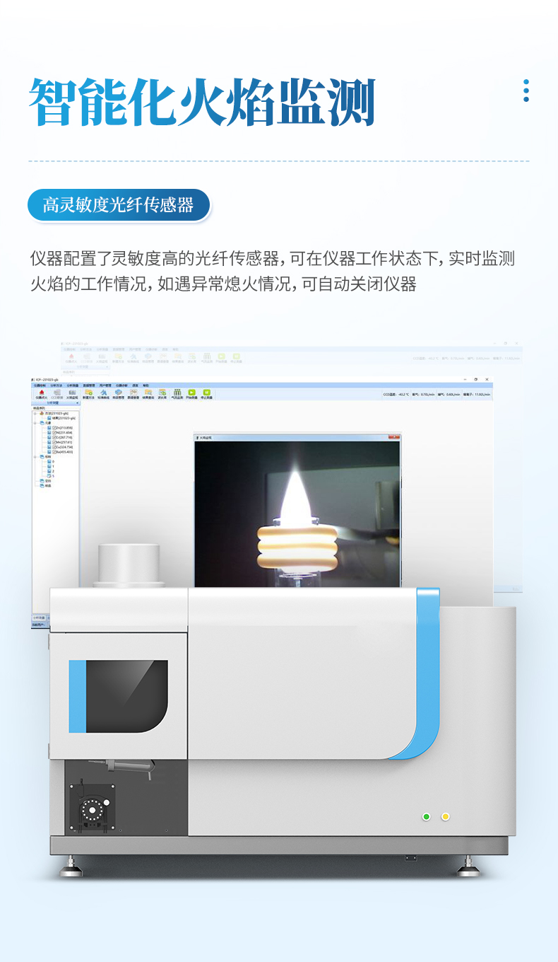 儀器配置了靈敏度極高的光纖傳感器,可在儀器工作狀態下,實時監測火焰的工作情況,如遇異常熄火情況,可自動關閉儀器。