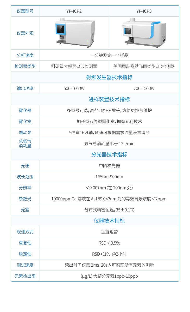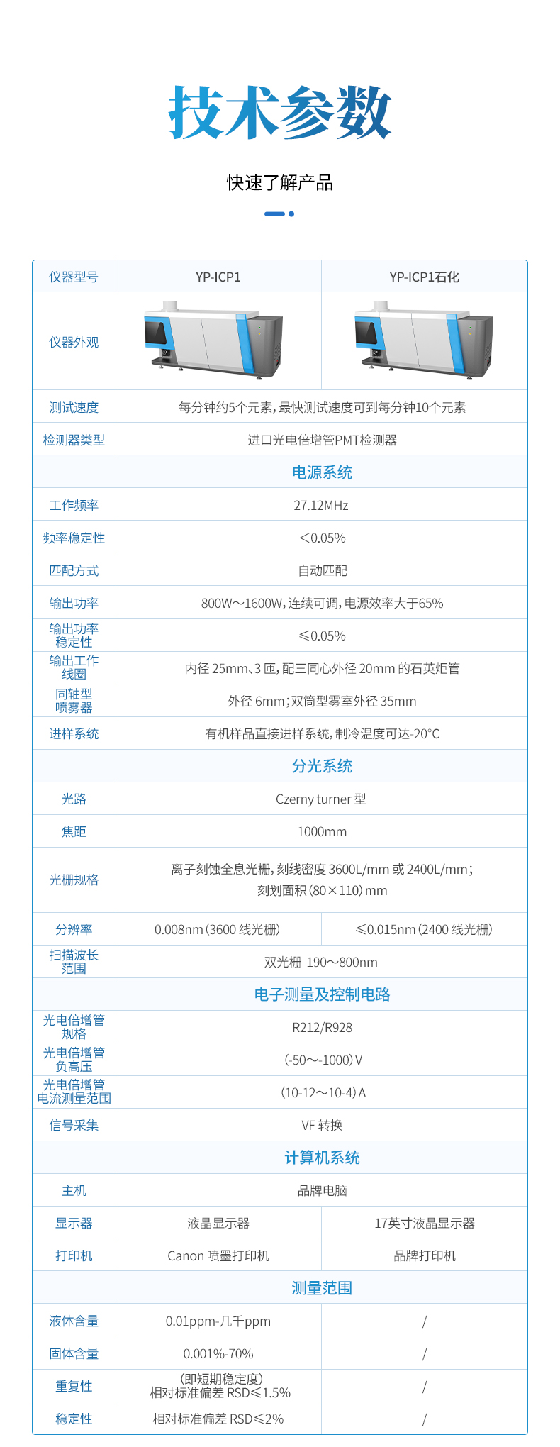 全譜直讀型電感耦合等離子體發射光譜儀是一款性能優異的全譜直讀型 ICP 光譜儀,用于測定不同物質中的常量、微量、痕量元素含量,可用于樣品中 元素的定性、半定量及精確定量分析,檢出限可達十億分之一。
