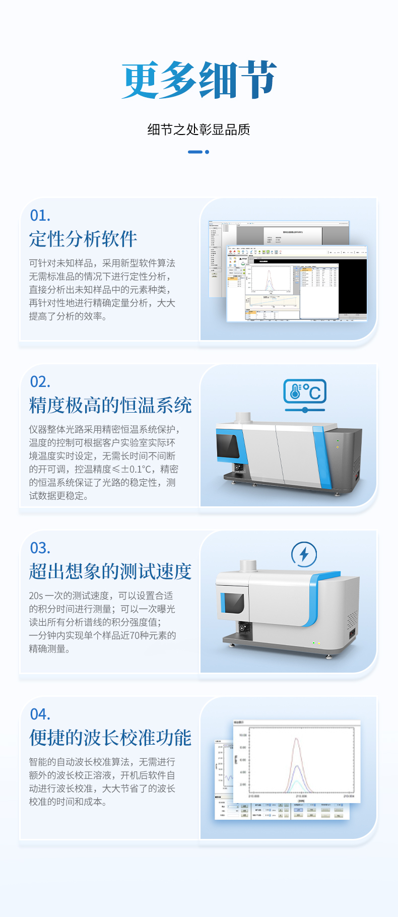 20s 一次的測試速度,可以設置合適的積分時間進行測量;可以一次曝光讀出所有分析譜線的積分強度值;一分鐘內實現單個樣品近 70 種元素的精確測量。