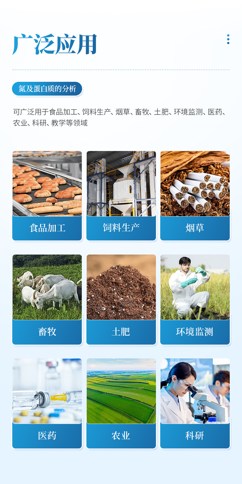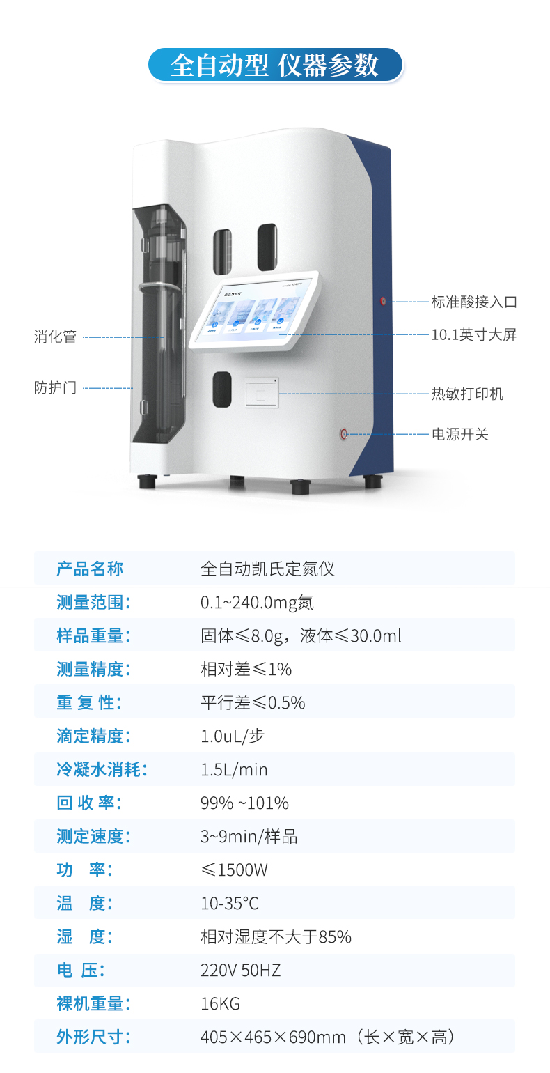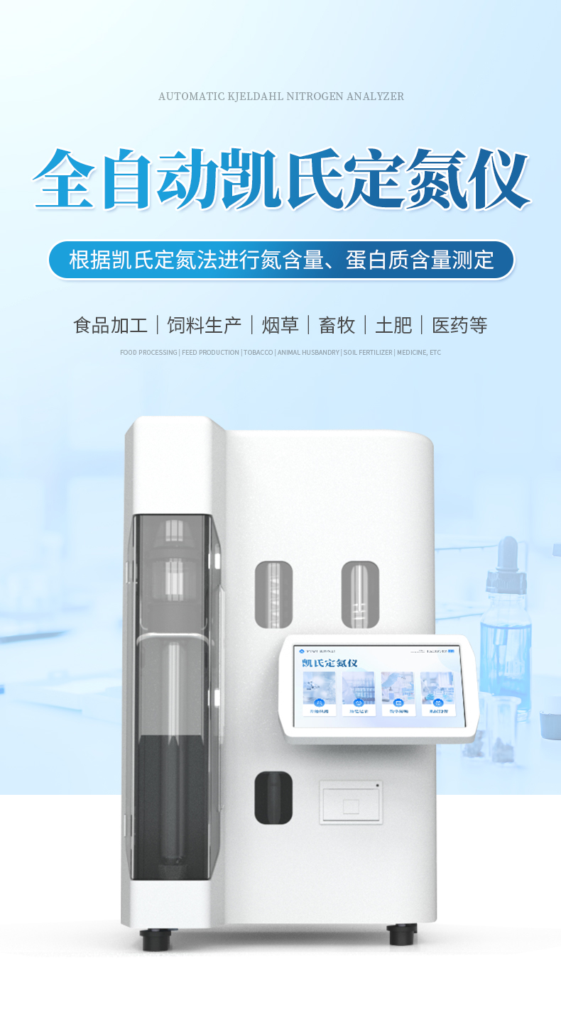 全自動凱氏定氮儀是根據(jù)凱氏定氮法進行氮含量、蛋白質(zhì)含量測定的自動化儀器。可廣泛用于食品加工、飼料生產(chǎn)、煙草、畜牧、土肥、環(huán)境監(jiān)測、醫(yī)藥、農(nóng)業(yè)、科研、教學(xué)等領(lǐng)域氮及蛋白質(zhì)的分析。