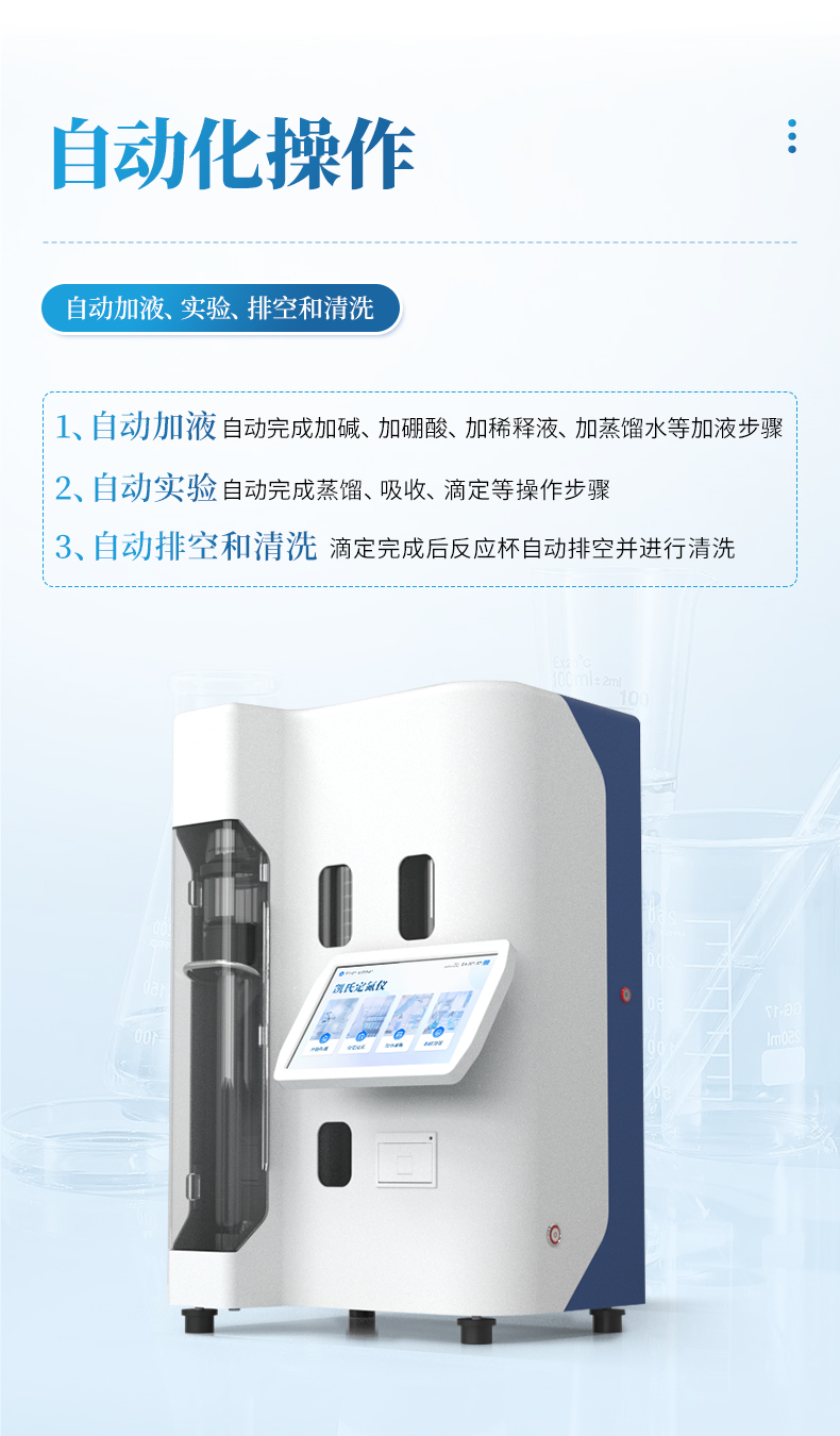 (2) 自動完成加堿、加硼酸、加稀釋液、加蒸餾水等加液步驟;自動完成蒸餾、吸收、滴定等操作步驟;滴定完成后反應(yīng)杯自動排空和清洗。