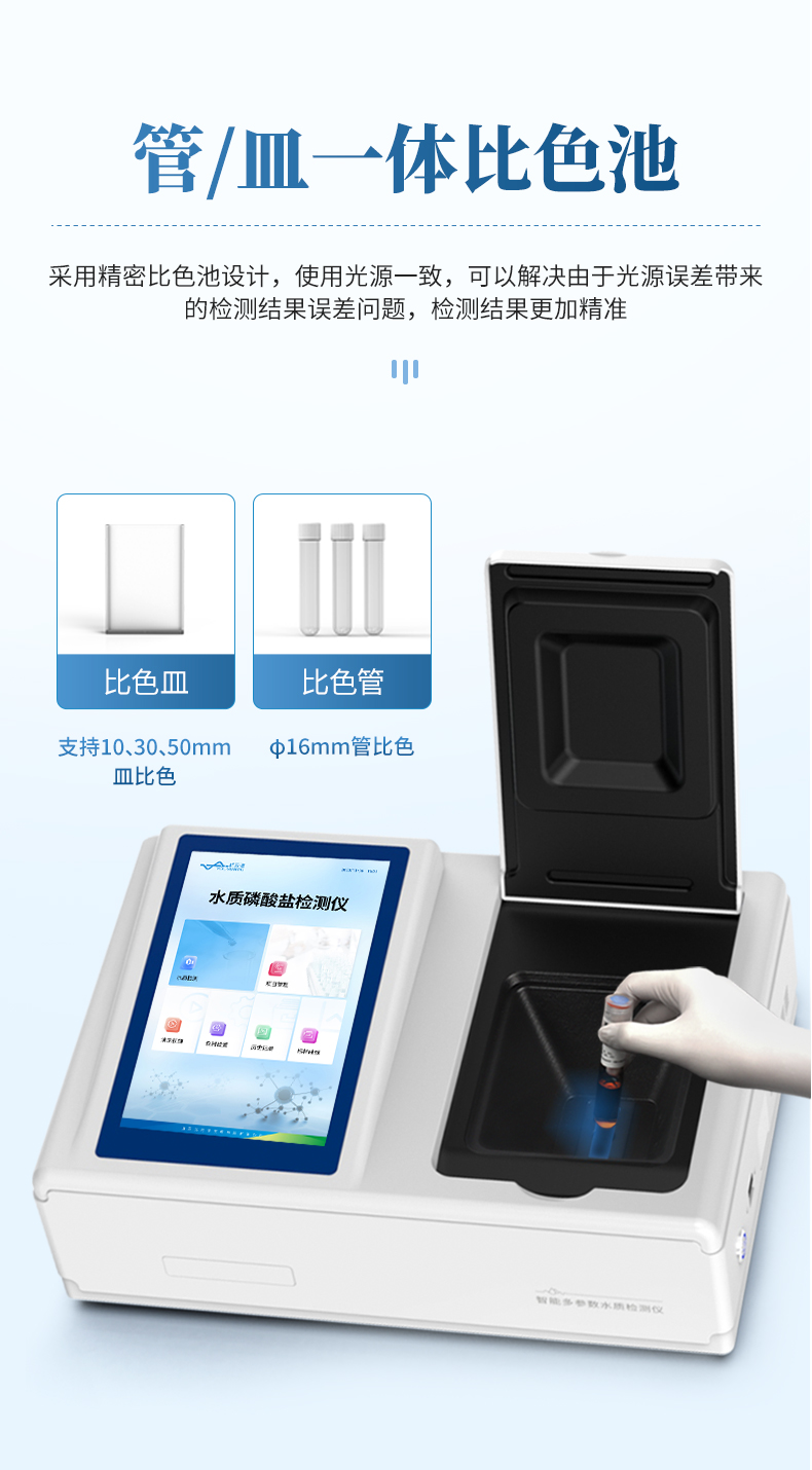 提取一定量水體樣品,經過前處理后根據不同檢測項目按照試劑說明書滴入檢測試劑,檢測試劑會與水體中的待測物質發生反應,反應液呈現特定的顏色。