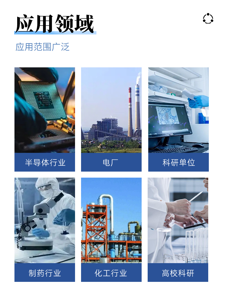 3、在線監(jiān)測(cè)制藥工業(yè)的制水系統(tǒng)、半導(dǎo)體工業(yè)的超純水制備系統(tǒng)和晶片工藝過程、電廠去離子水制備過程等。