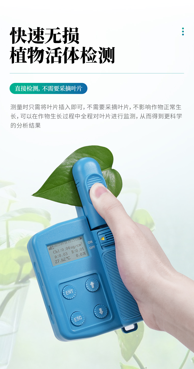 1.快速無損植物活體檢測,測量時只需將葉片插入即可,不需要采摘葉片,不影響作物正常生長,可以在作物生長過程中全程對葉片進行監測,從而得到更科學的分析結果