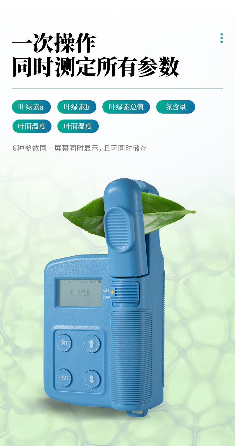 3.一次操作可同時測定所有參數,葉綠素a、葉綠素b、葉綠素總值、氮含量、葉面溫度、葉面濕度6種參數同一屏幕同時顯示,且可同時儲存