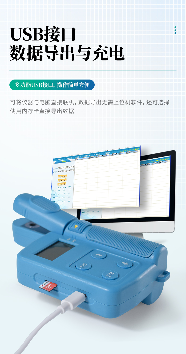 5.多功能USB接口,可實現數據導出與充電功能,可將儀器與電腦直接聯機,數據導出無需上位機軟件,還可選擇使用內存卡直接導出數據,操作簡單方便