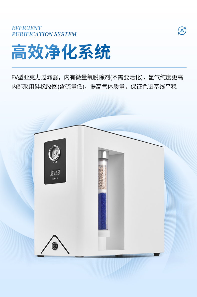 2、FV型亞克力過濾器,內有微量氧脫除劑(不需要活化),氫氣純度更高;儀器內部采用硅橡膠圈(含硫量低),有效提高氣體質量,保證色譜基線平穩。