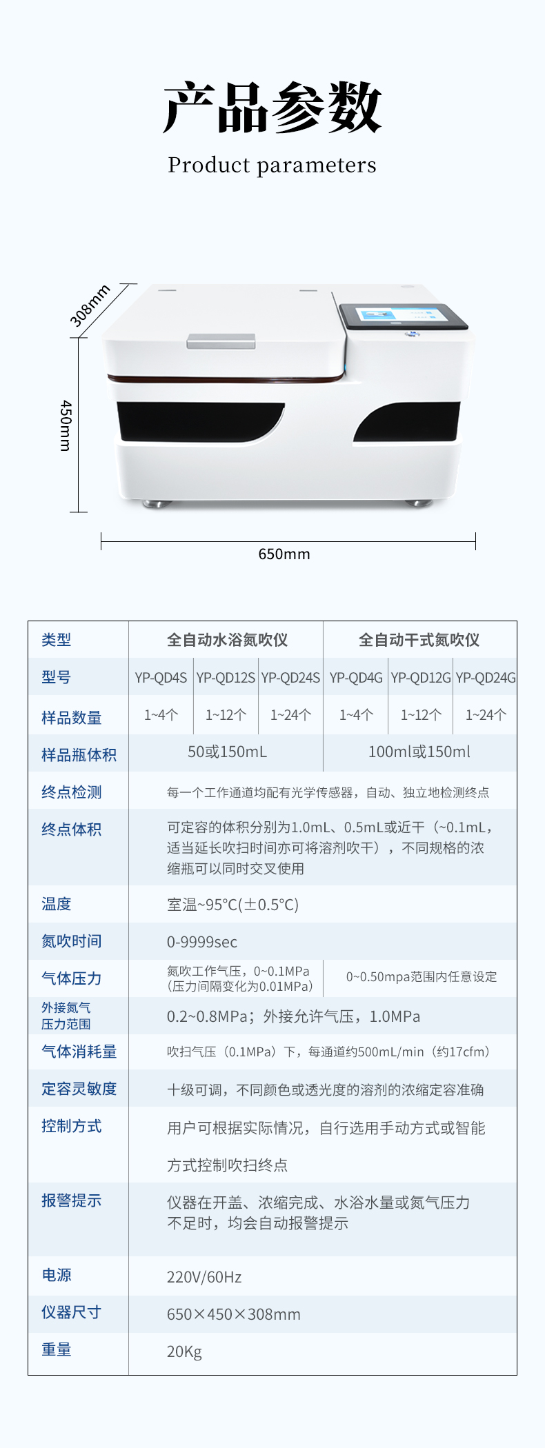 全自動多功能干式氮吹儀YP-QD12G是我司結合實驗室使用需求,從使用者方便安全快捷穩定等多角度共同開發的新型濃縮定容產品,產品擺脫了常規市場上利用水浴加熱揮發而導致樣品進行污染的弊端,確定樣品的安全性與準確性,具有無人值守、準確定容、大批量濃縮的特點,可多組數據儲存功能,實現了全自動化的定量及批量濃縮,濃縮全程,讓繁瑣的濃縮過程變得靈活、省心、高效和安全。