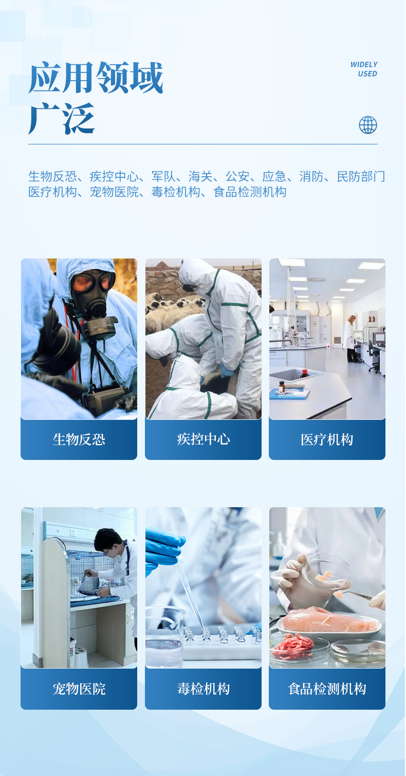 生物反恐、疾控中心、軍隊、海關、公安、應急、消防、民防部門、寵物醫院、毒檢機構、食品檢測機構