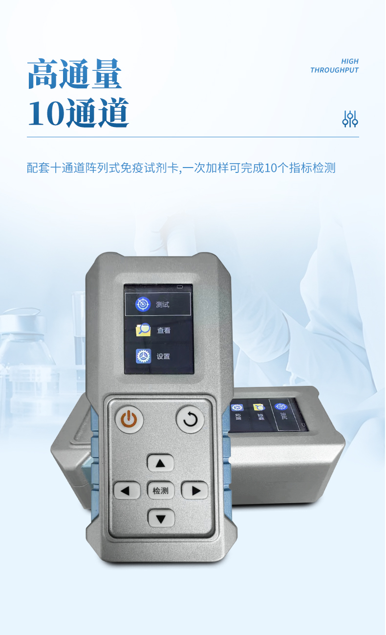 高通量 — 配套十通道陣列式免疫試劑卡,一次加樣可完成10個指標檢測。