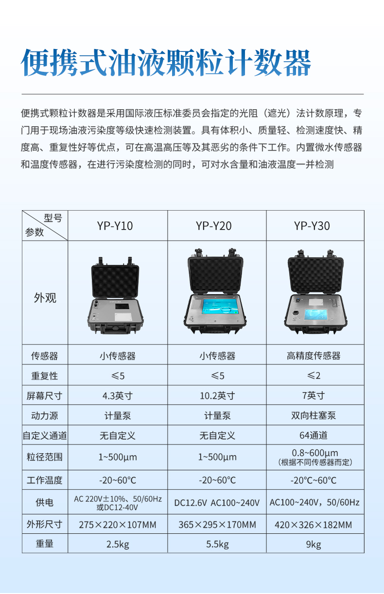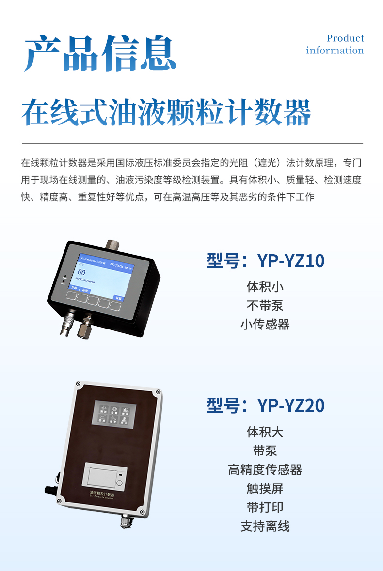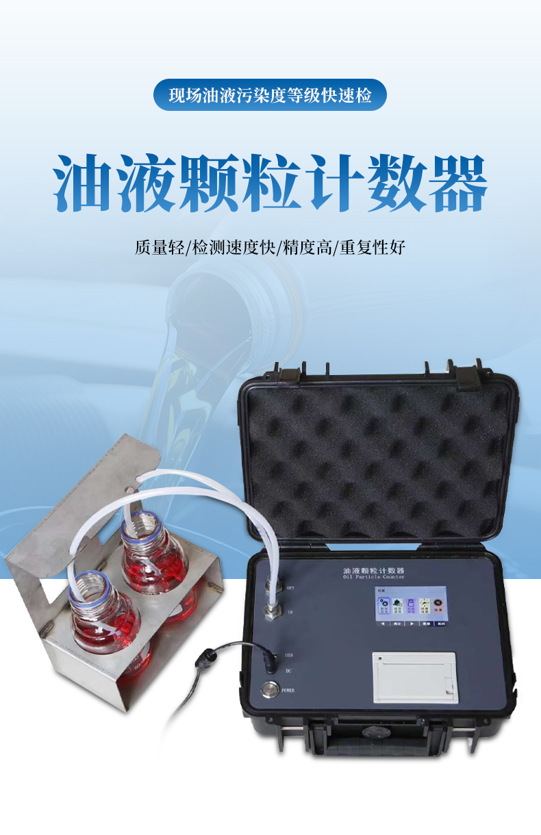 YP-Y10便攜式顆粒計數器是采用國際液壓標準委員會指定的光阻(遮光)法計數原理,專門用于現場油液污染度等級快速檢測裝置。具有體積小、質量輕、檢測速度快、精度高、重復性好等優點,可在高溫高壓等及其惡劣的條件下工作。內置微水傳感器和溫度傳感器,在進行污染度檢測的同時,可對水含量和油液溫度一并檢測。適用于發動機油、齒輪油、變壓器油(即絕緣油)、液壓油、潤滑油、合成油等油液,可廣泛應用于電力電廠、航空航天、石油化工、交通港口、鋼鐵冶金、汽車制造等領域。