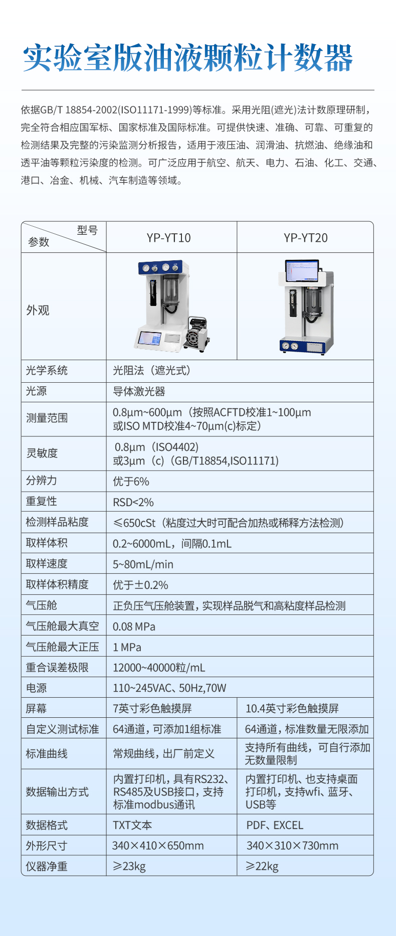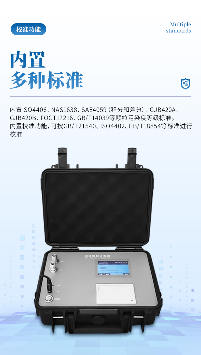 l內置ISO4406、NAS1638、SAE4059、GJB420A、GJB420B、ГOCT17216、GB/T14039等顆粒污染度等級標準